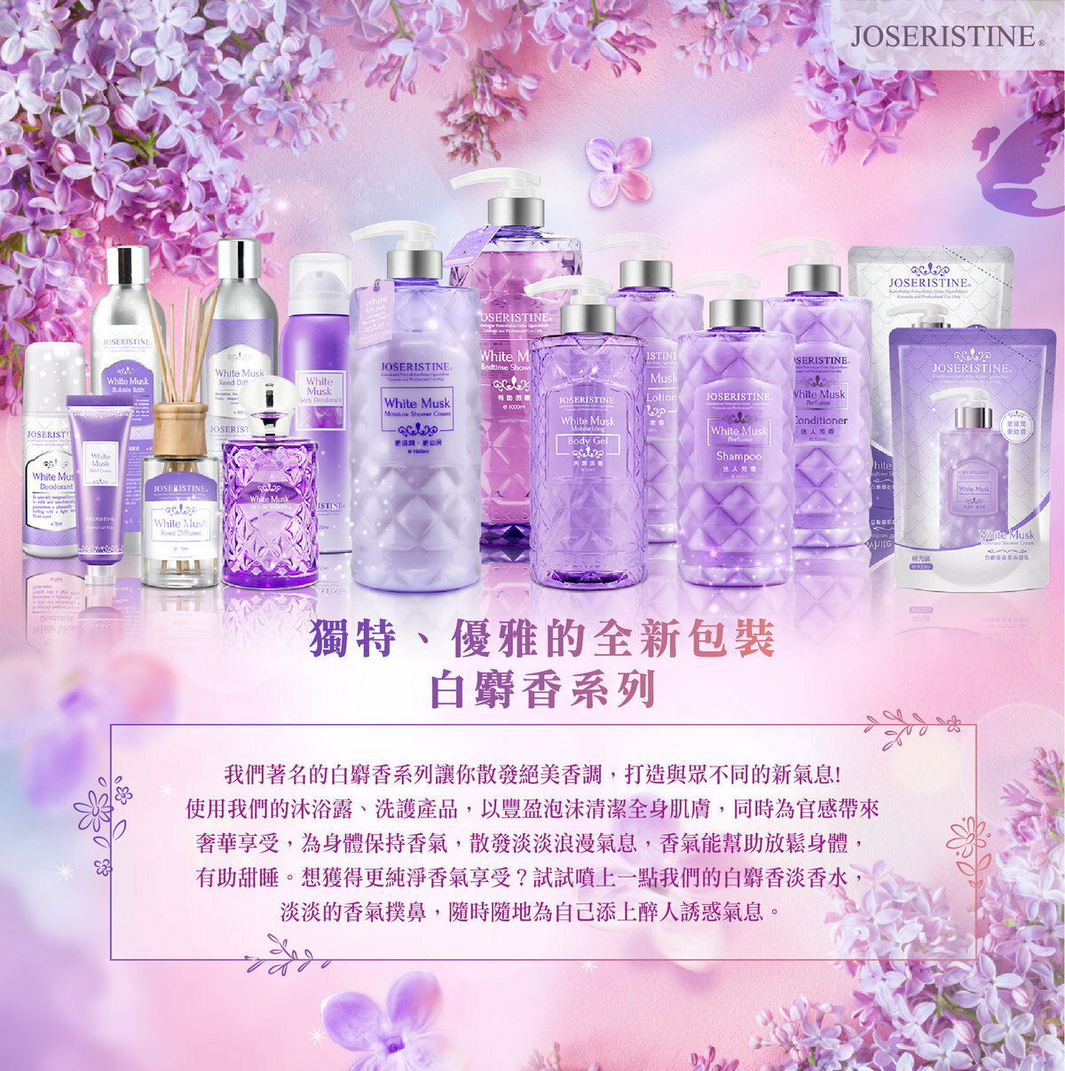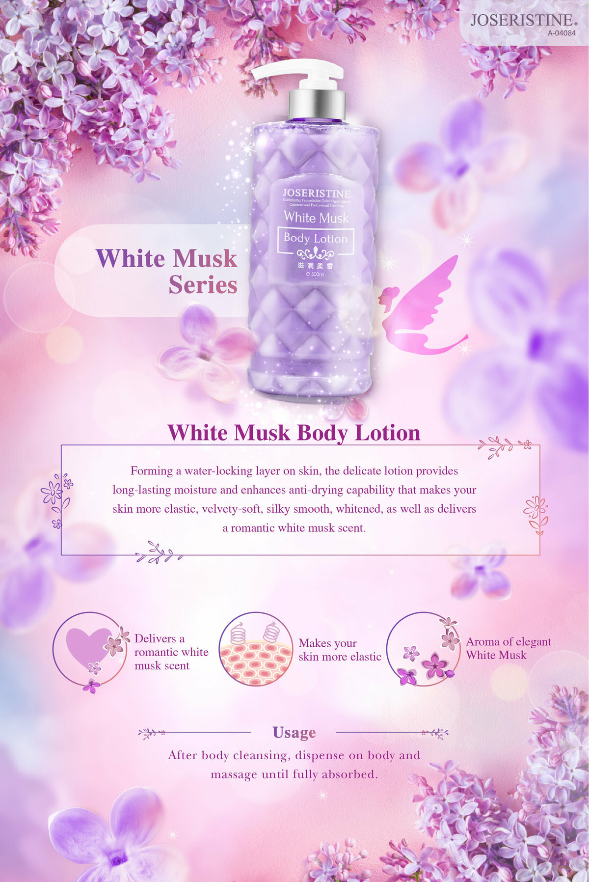 細膩潤滑的乳液於肌膚表面形成鎖水保護膜,牢牢鎖住水分,為肌膚提供持久滋養,提升肌膚抗乾燥能力,回復肌膚彈性,締造絲滑嫩白肌膚,並散發浪漫迷人的白麝香香味。