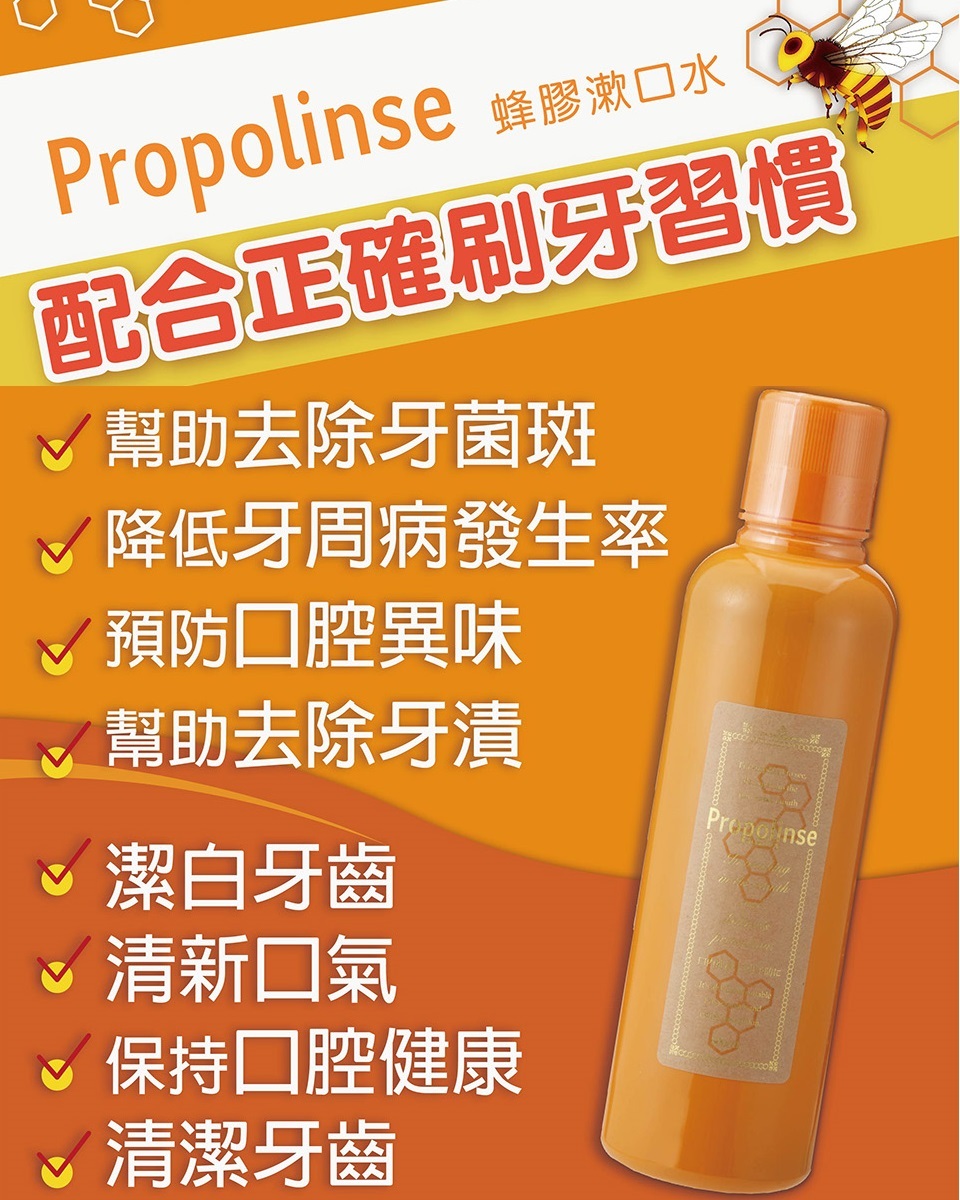 日本Propolinse 蜂膠漱口水,榮獲日本Cosme口腔類第1位激賞!含茶葉及蜂膠萃取,軟化牙齒裡面隱藏的污垢,分解口腔的微生物及細菌;不含氟化物和水楊酸內酯,不刺激口腔膜。20 秒清除牙石,以天然成份製造,加入珍貴蜂膠,容易入口,保護你的牙齒!