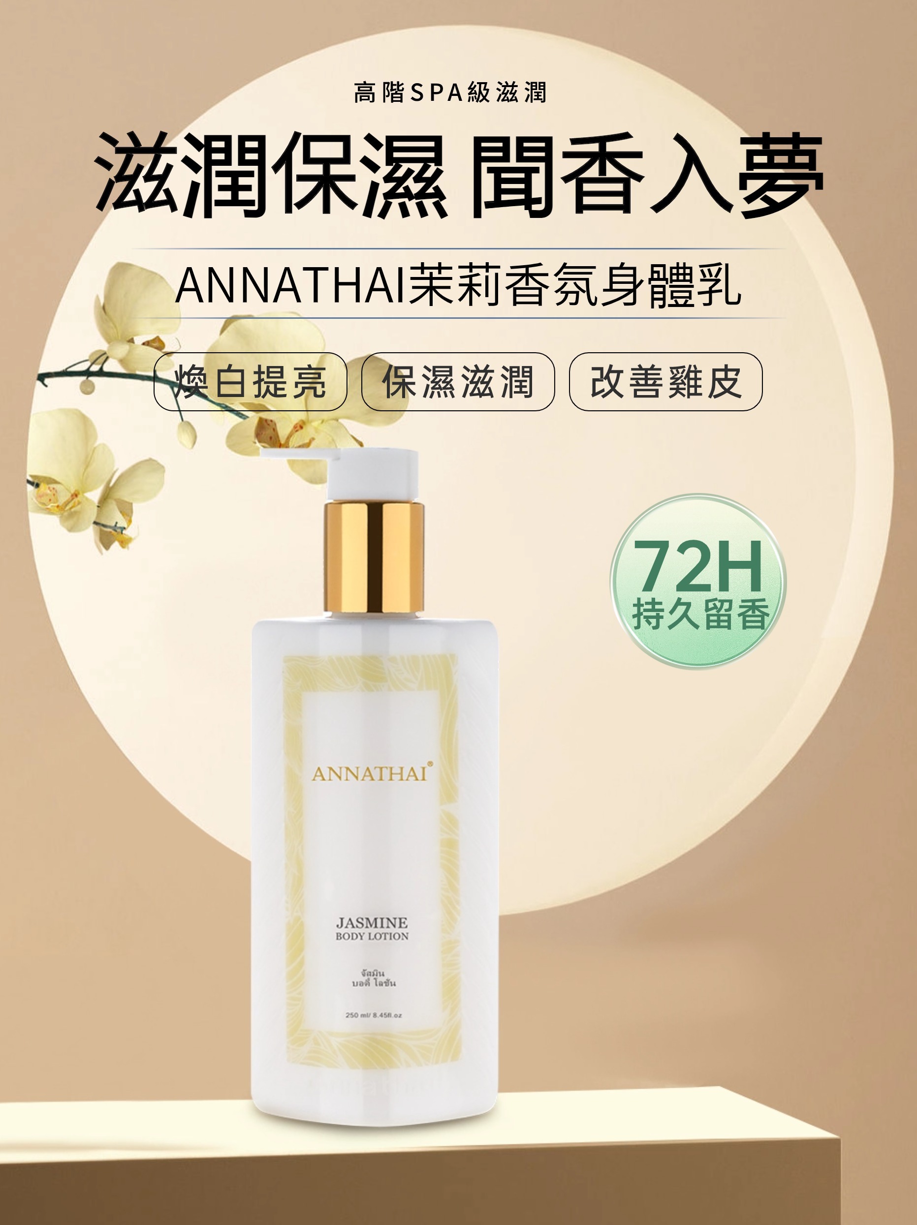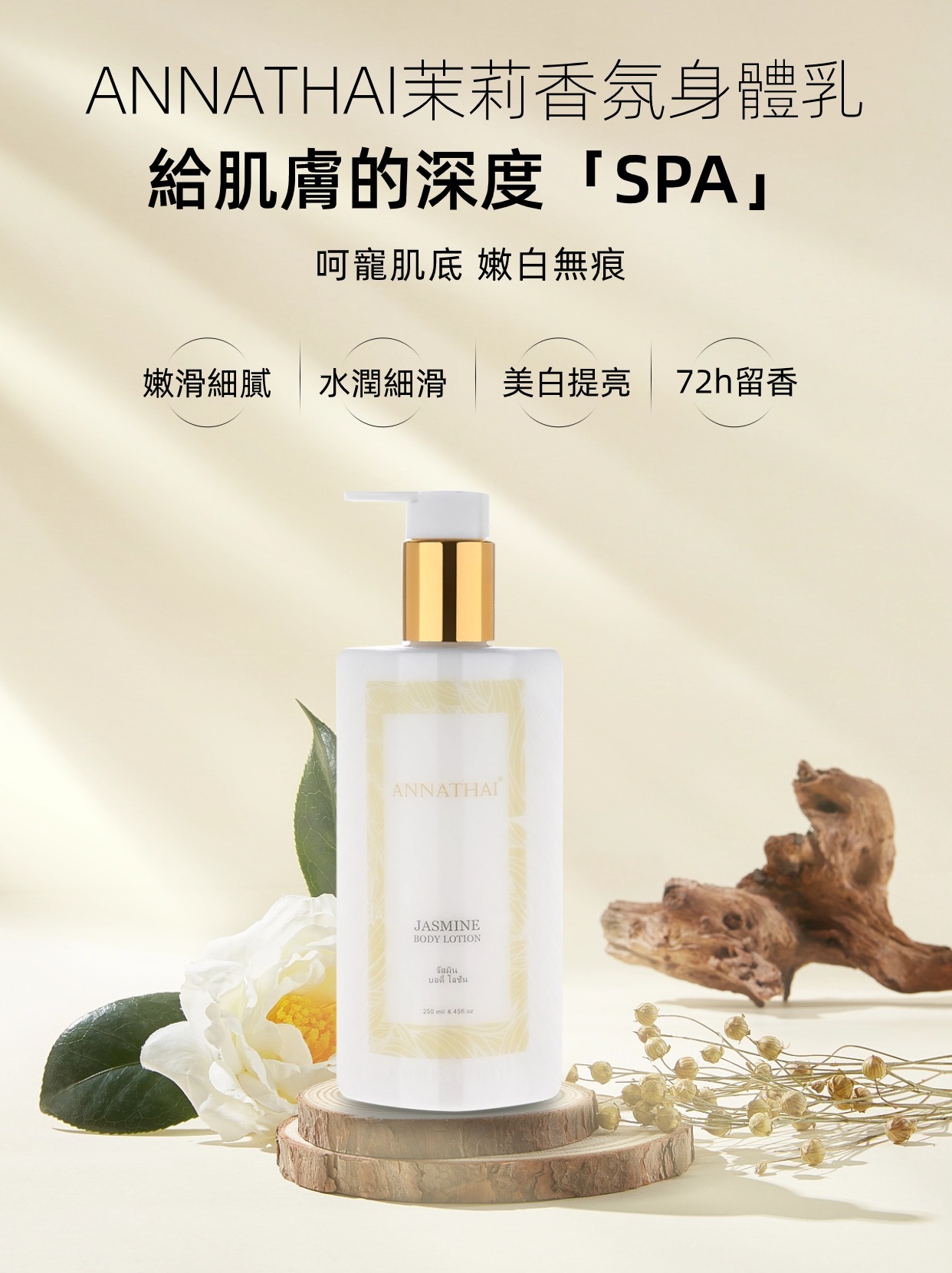Annathai泰國茉莉身體乳,100%天然茉莉花萃取,且富含天然米糠油及蘆薈成分,使肌膚光滑柔軟,每天使用維持彈性水嫩。質地輕盈好吸收。使用後散發的柔和茉莉花香,猶如在盛開的茉莉花園中漫步般甜美高雅。